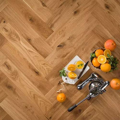 Неограниченная вариация цвета. Присутствуют отреставрированные сучки, контрастная заболонь, прожилки, свилеватость, червоточины. Специальная технология покрытия проявляет сучки и прочие неоднородности, подчеркивает природную красоту, неповторимость и многообразие текстурного рисунка дуба.